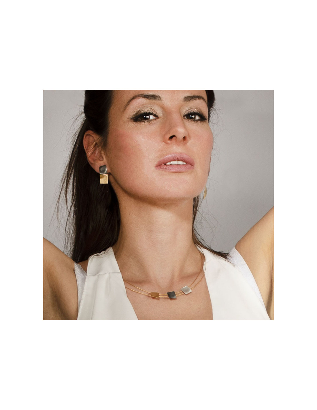 Collar pequeño Colección Quadrats. Es un collar de tres piezas en Plata, Plata negra y Plata bañada en Oro.